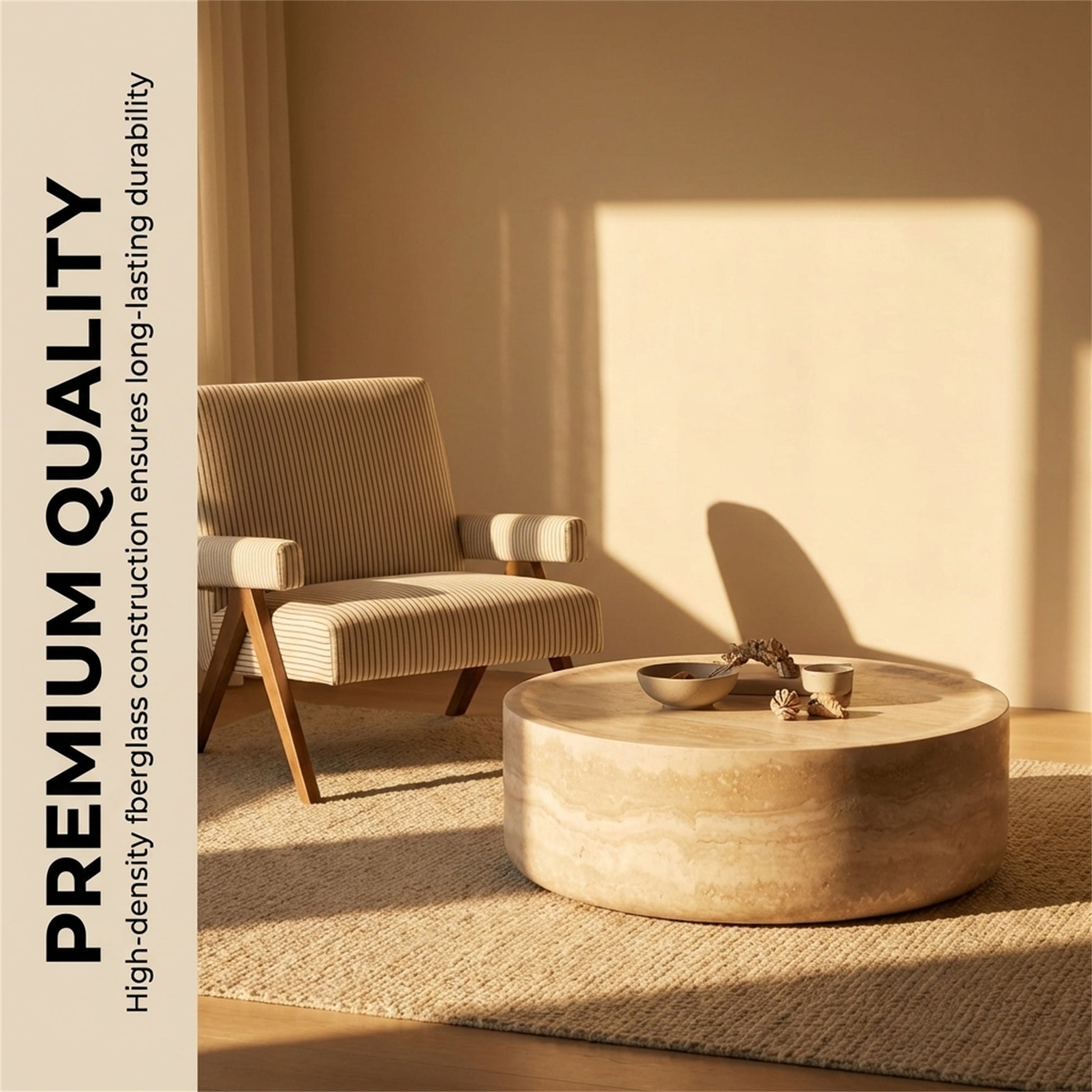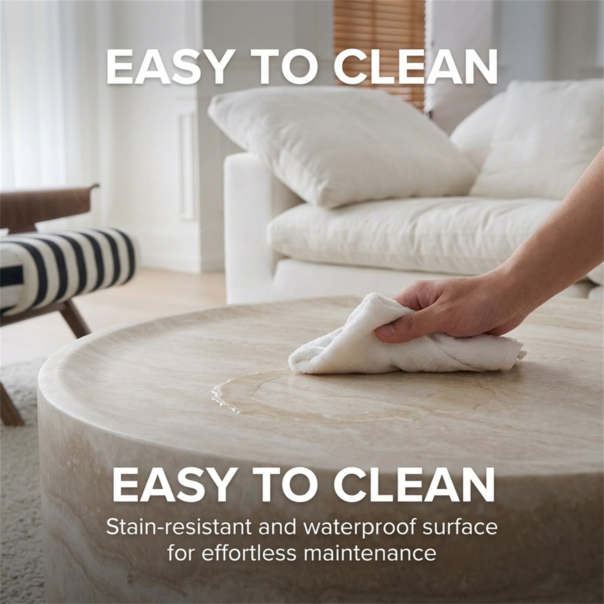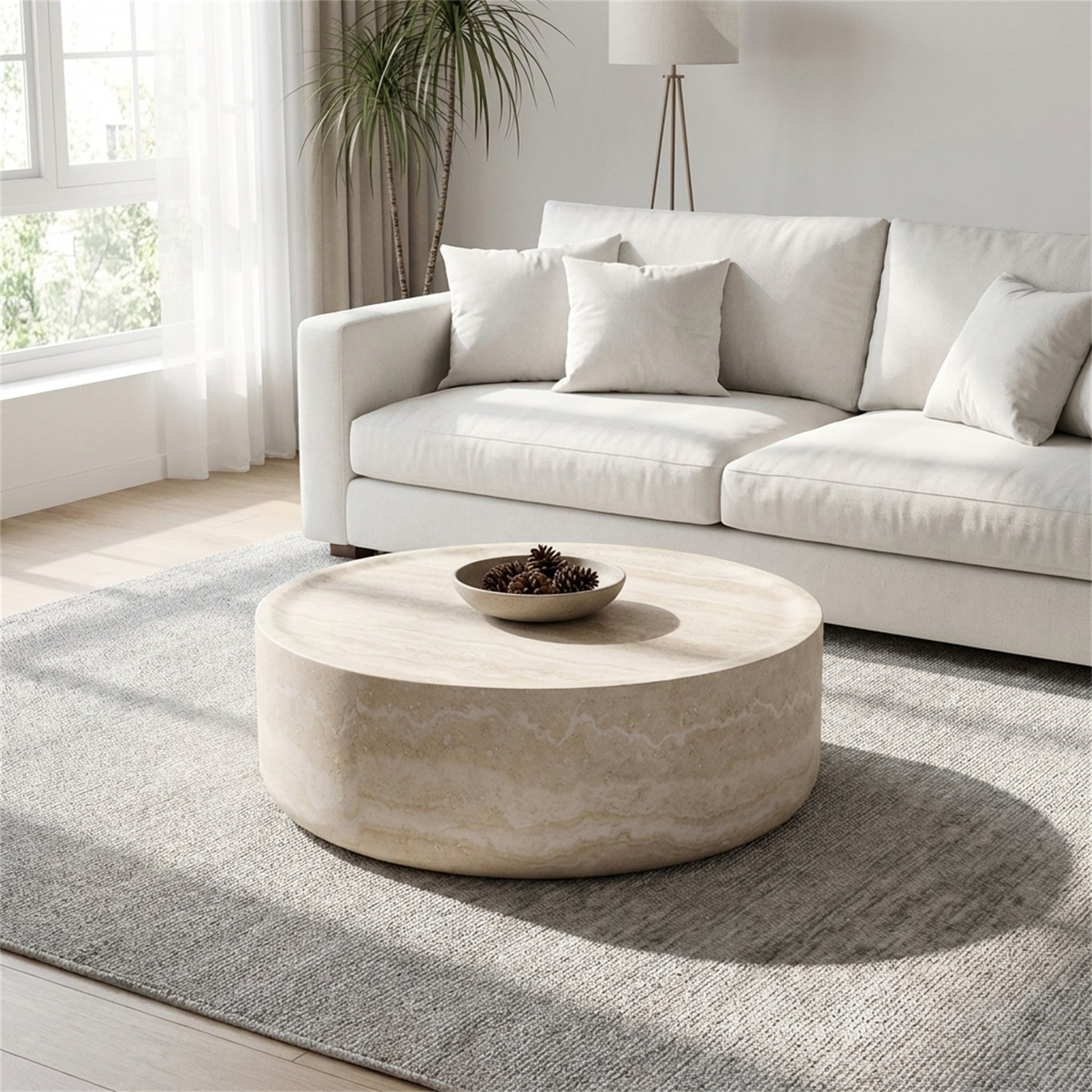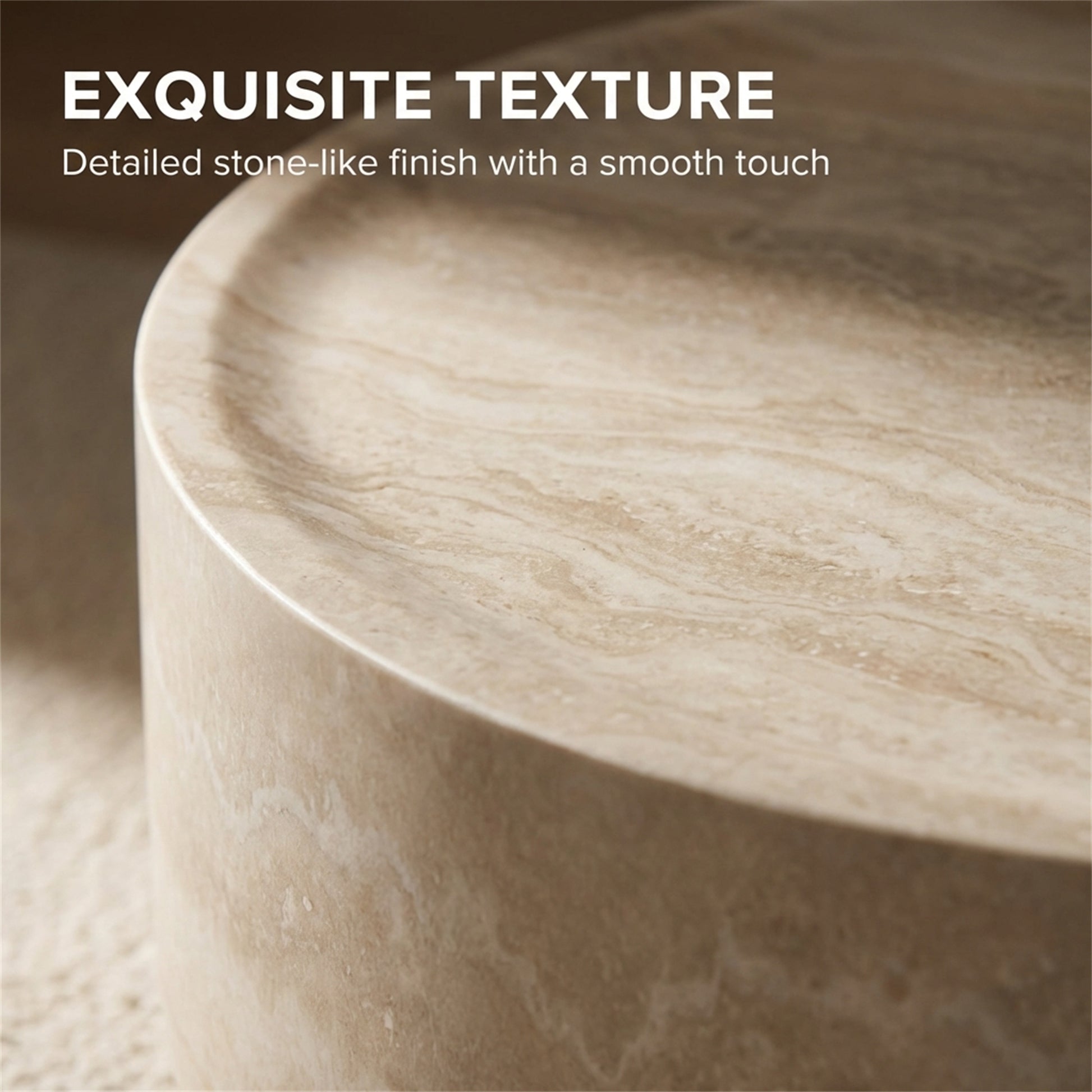 Modern Coffee Table Faux Travertine Textured for Livingroom/OfficeFeaturing a simple modern design and no any frills, this circle coffee table can be naturally integrated into a variety of home decor. With a sturdy and refined structure. Wear-resistant coating and sturdy construction can ensure long time use and not easily damaged. Large Storage Space---Our round coffee table has a spacious surface for everyday use and can hold your different types of items, such as books, toys, snacks. its the perfect space-saver solution for a small apartment or large home. Ample space makes your home and room tidy and clean. The look of elegant and luxury, perfectly balance the classic style with modern design for our circular coffee table. Also, this round table is scratch-resistant, waterproof and easy to clean.