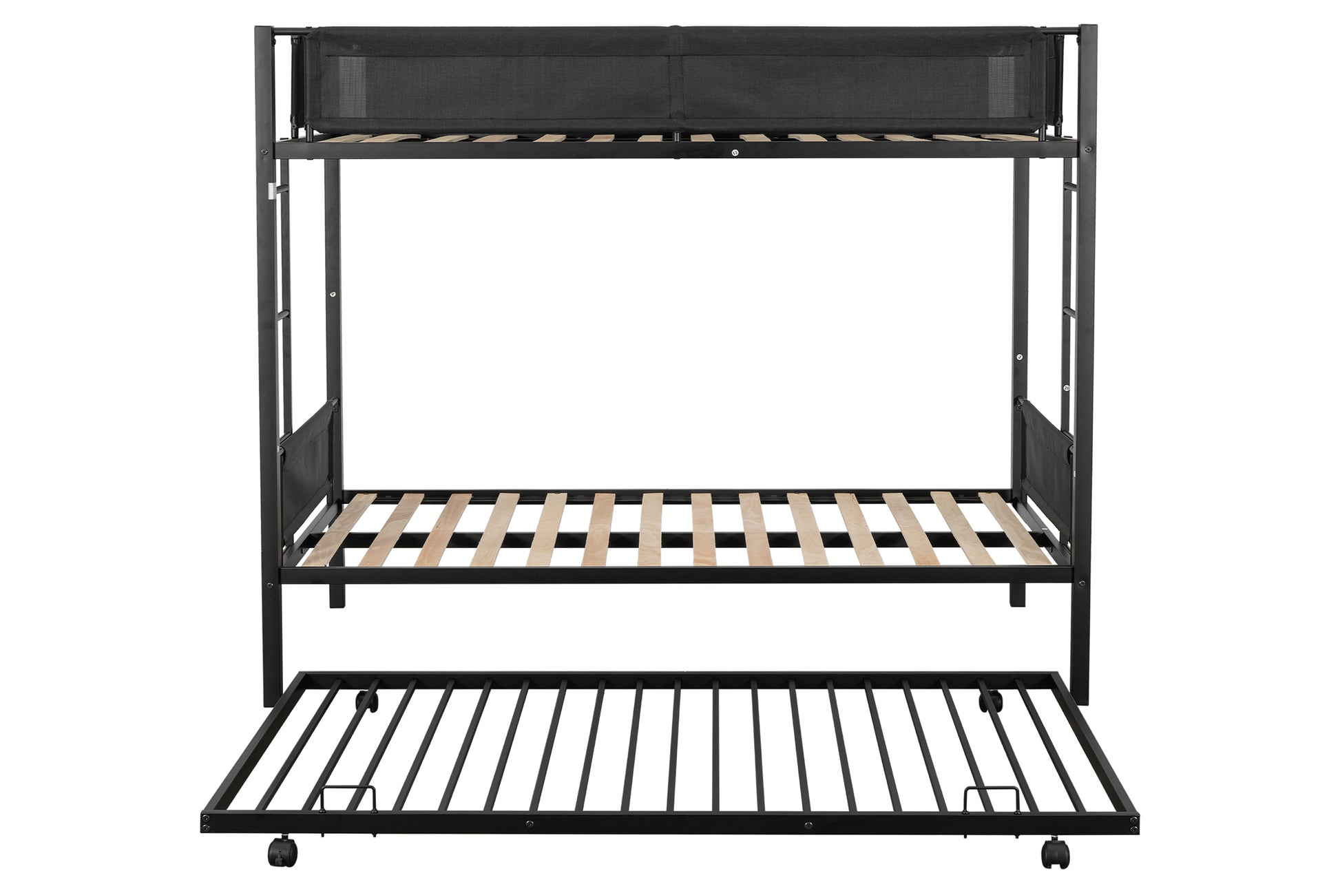 Metal Twin over twin bunk bed with Trundle/ Sturdy Metal Frame/ Noise-Free Wood Slats/ Comfortable Textilene Guardrail/ 2 side Ladders/ Space-Saving Trundle/ Bunk Bed for Three/ No Box Spring Needed